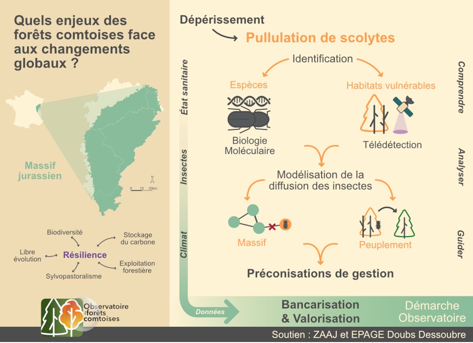 Ce projet cherche Ă comprendre le rĂŽle du paysage dans la diffusion des scolytes dans le massif jurassien. Il regroupe des compĂ©tences et des champs thĂ©matiques variĂ©s en Ă©cologie, en gĂ©ographie, en gestion et analyse de donnĂ©es environnementales complexes. Le projet sâinscrit dans lâObservatoire des forĂȘts comtoises, sâappuyant sur lâexpertise des chercheurs et des partenaires territoriaux en vue dâapporter des rĂ©ponses concrĂštes aux gestionnaires des forĂȘts face au dĂ©pĂ©rissement actuel.